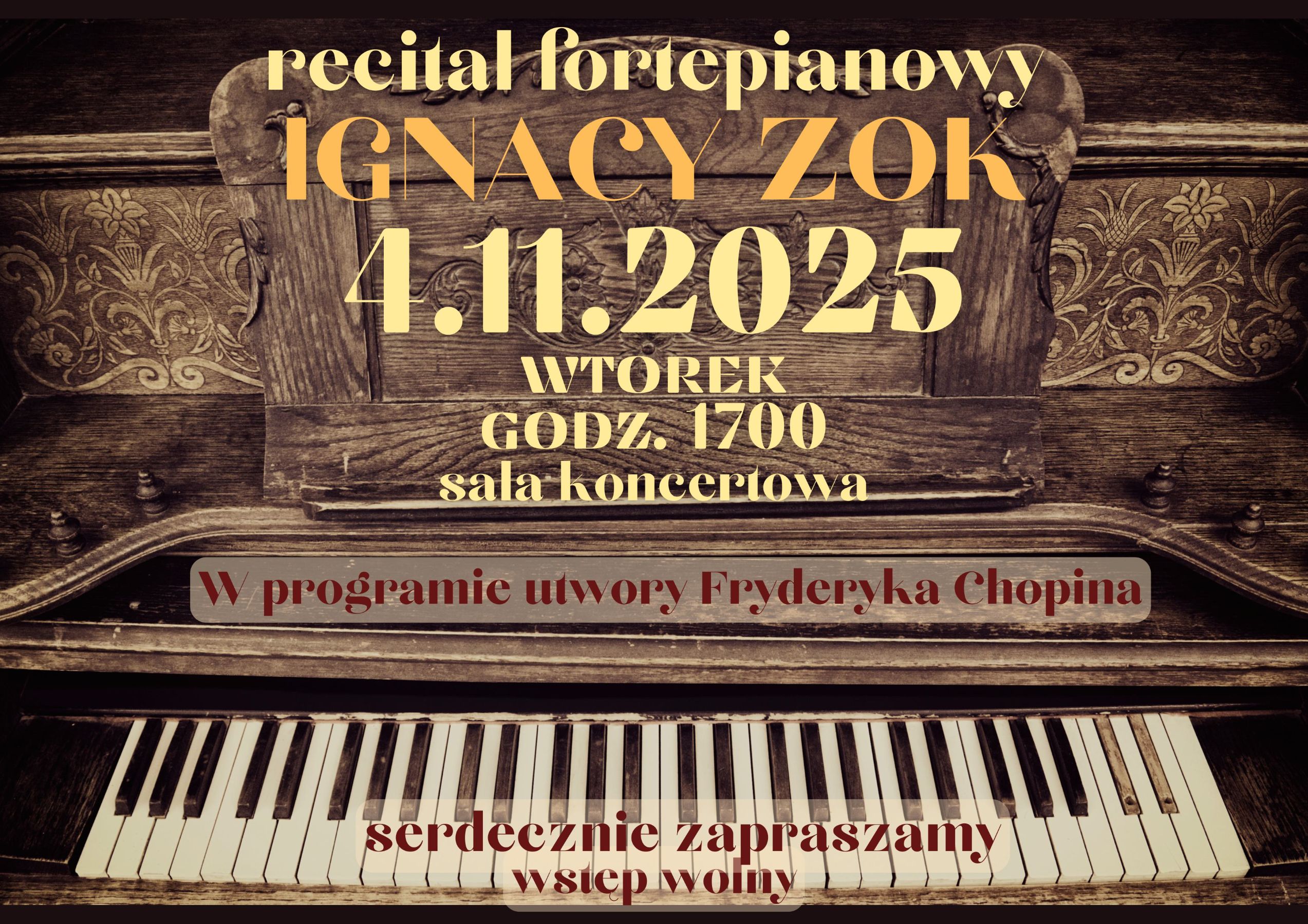 Z przyjemnością zapraszamy na recital fortepianowy Ignacego Zoka, który odbędzie się we wtorek 4 listopada 2025 r. o godz. 17.00 w sali koncertowej w Państ