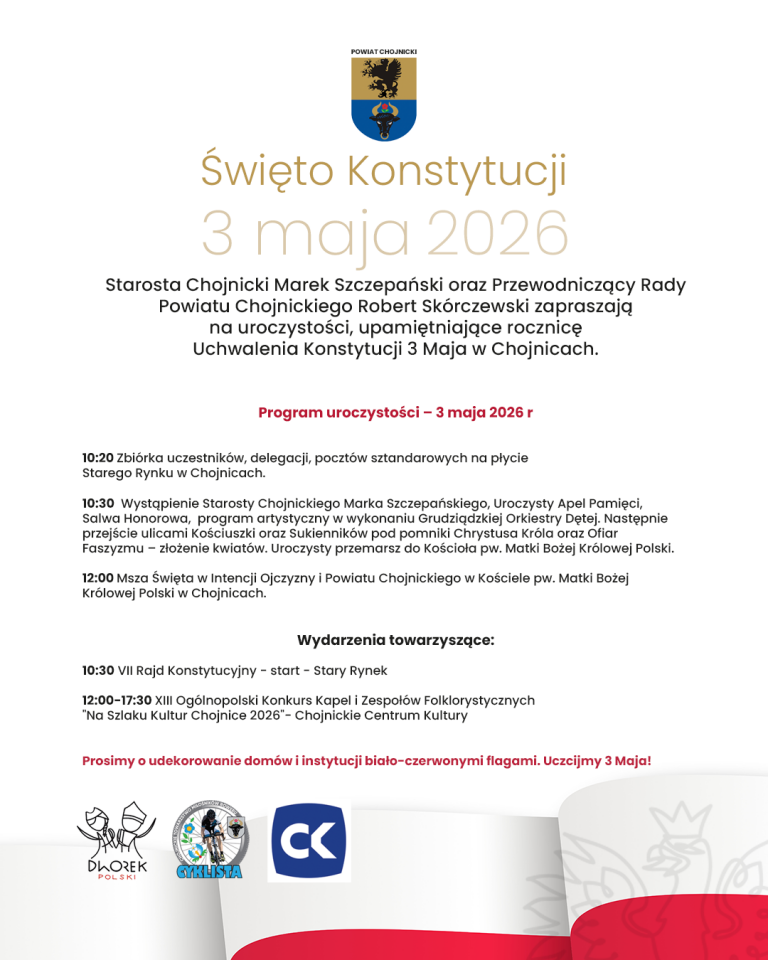 Stowarzyszenie "Dworek Polski" zaprasza 3 maja 2026 r. o godz. 17:00 do Chojnickiego Centrum Kultury, gdzie odbędzie się Koncert Finałowy&n