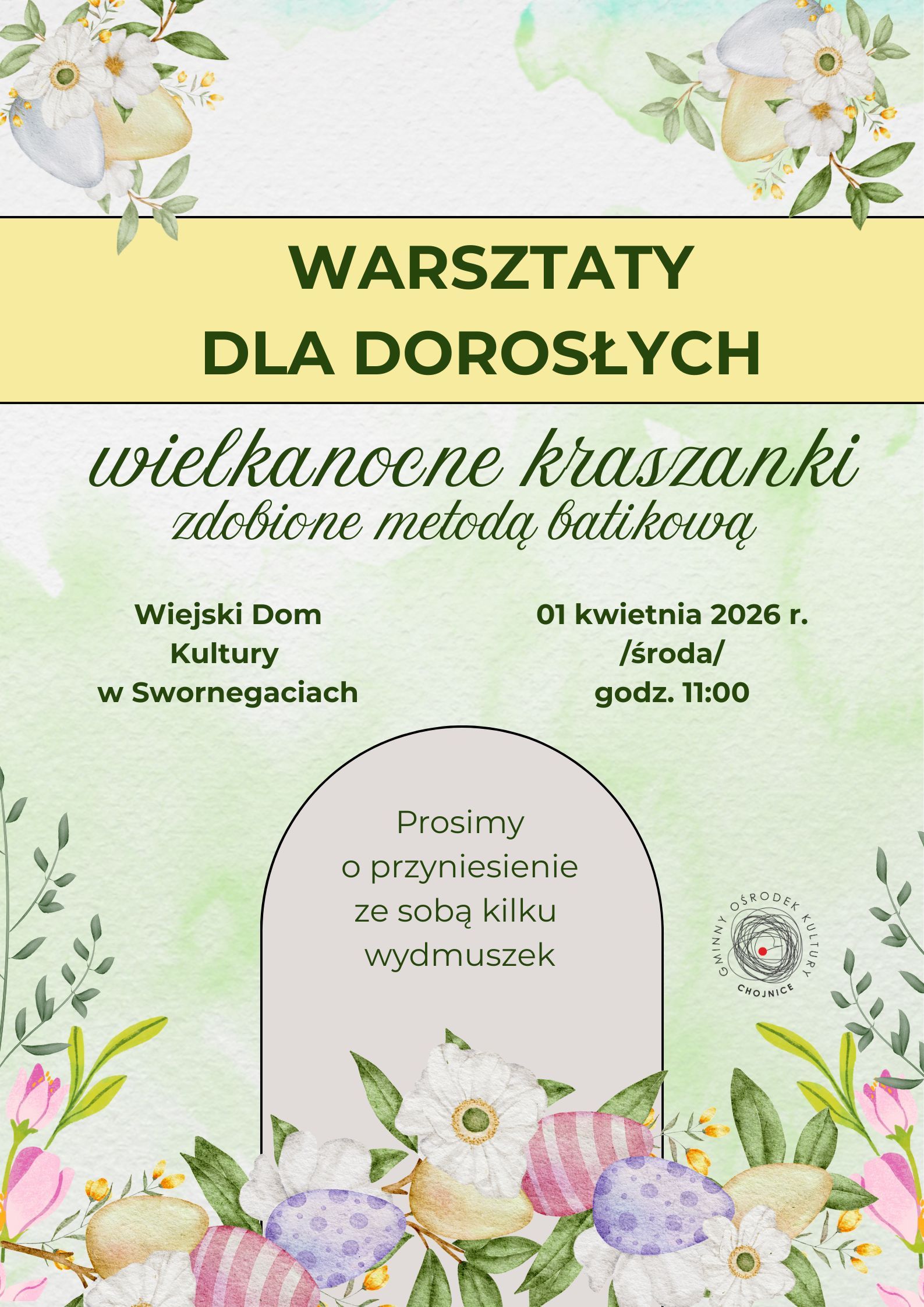 Gminny Ośrodek Kultury w Chojnicach serdecznie zaprasza na wyjątkowe warsztaty tworzenia tradycyjnych kraszanek wielkanocnych zdobionych dawną techniką batikową.