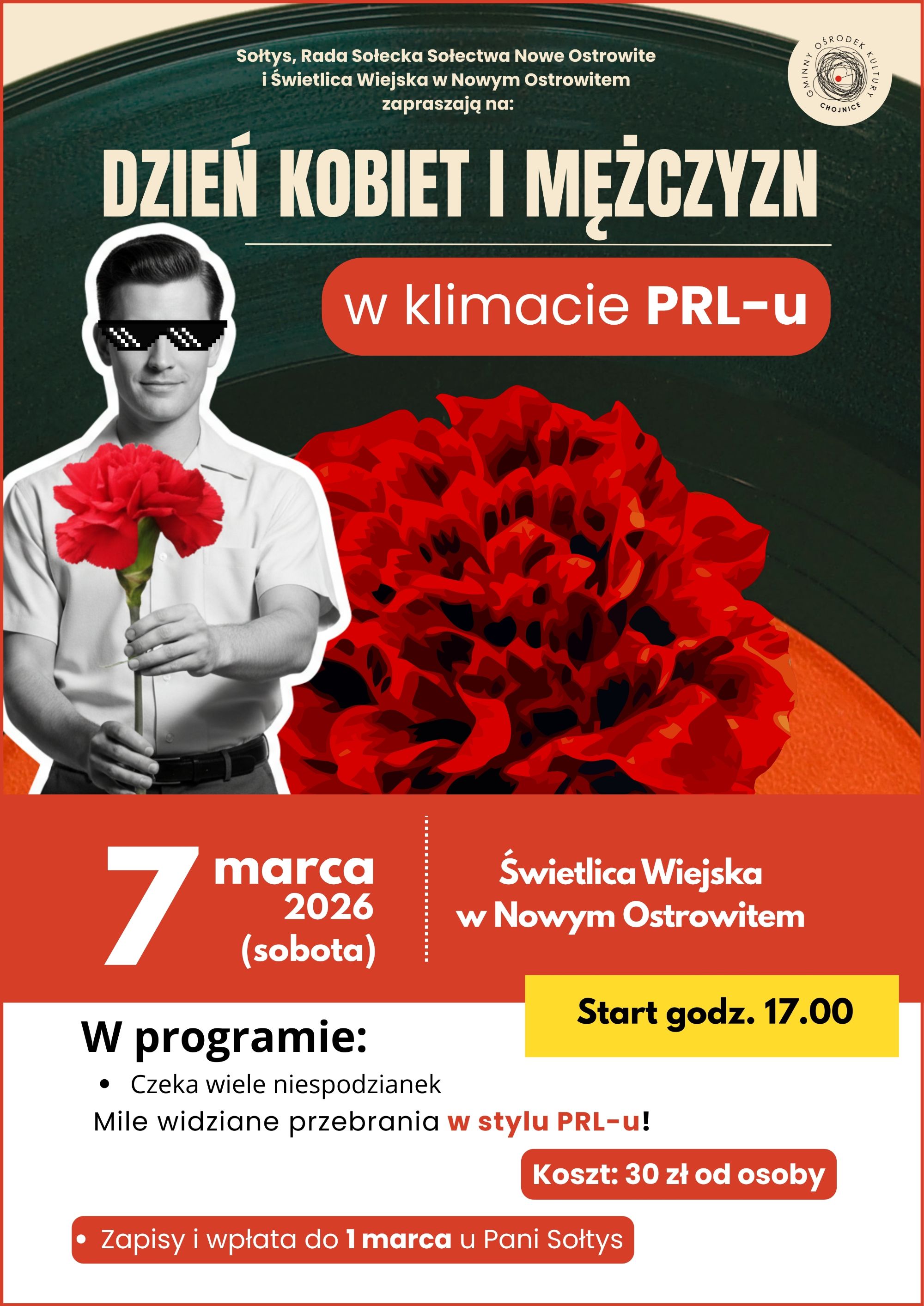 Sołtys, Rada Sołectwa Nowe Ostrowite i Świetlica Wiejska w Nowym Ostrowitem zapraszają na Dzień Kobiet i Mężczyzn w klimacie PRL-u, który odbędzie się 7 marca o godzinie 17:00. Koszt to 30 zł od osoby na gości czeka wiele niespodzianek.