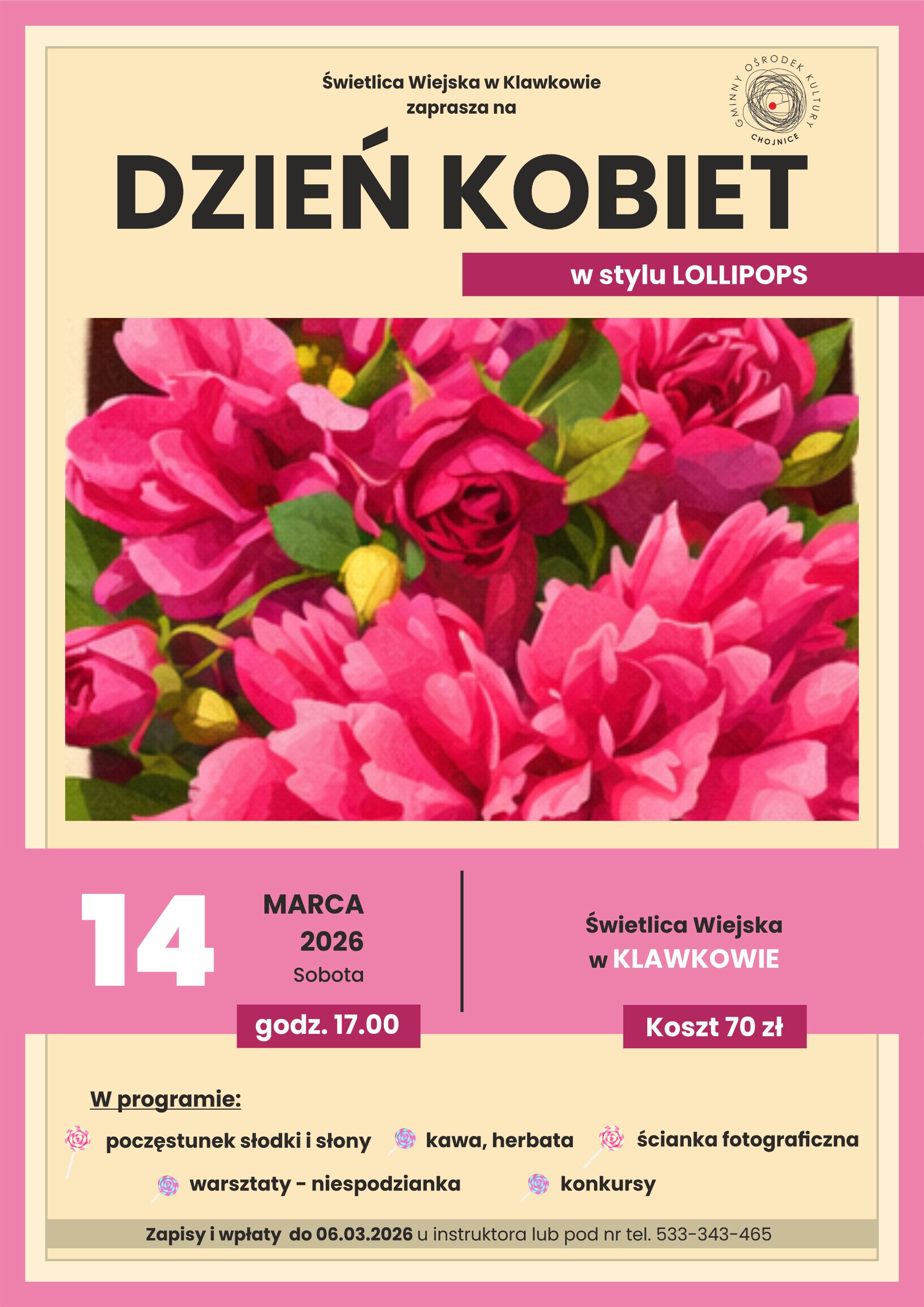 Świetlica Wiejska w Klawkowie zaprasza14 marca na Dzień Kobiet w stylu Lollipops. Początek od godziny 17:00. W programie poczęstunek słodki i słony, ścianka fotograficzna, warsztaty niespodzianka, konkursy. Koszt to 70 zł. Zapisy i wpłaty do 6 marca u instruktora pod numerem telefonu 533 343 465.