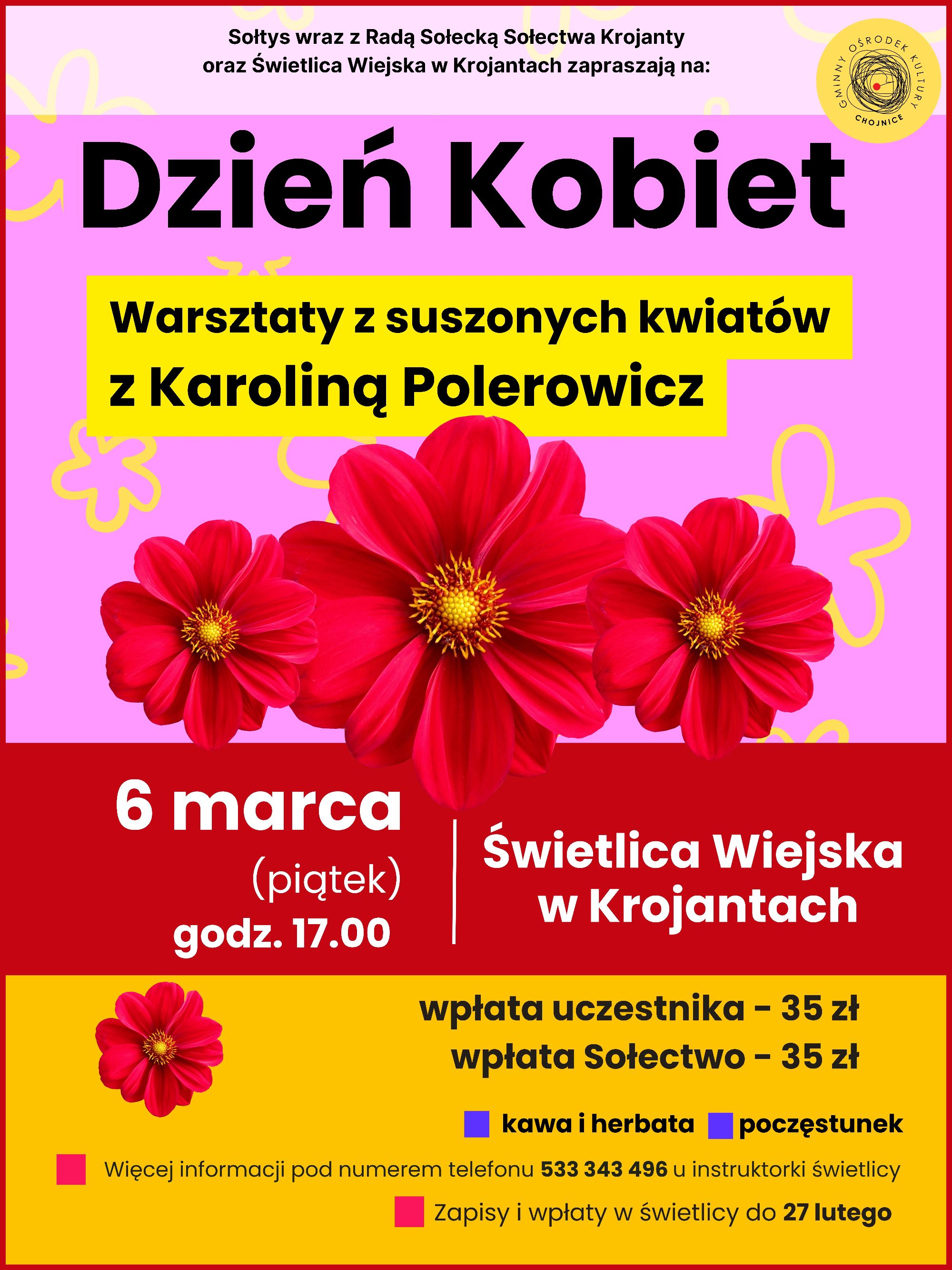 Sołtys wraz z Radą Sołecką Krojant oraz Świetlica Wiejska w Krojantach zapraszają 6 marca na Dzień Kobiet, podczas których odbędą się warsztaty z suszonych kwiatów z Karoliną Polwrowicz. Początek o godzinie 17:00. Zapisy i wpłaty w świetlicy do 27 lutego.