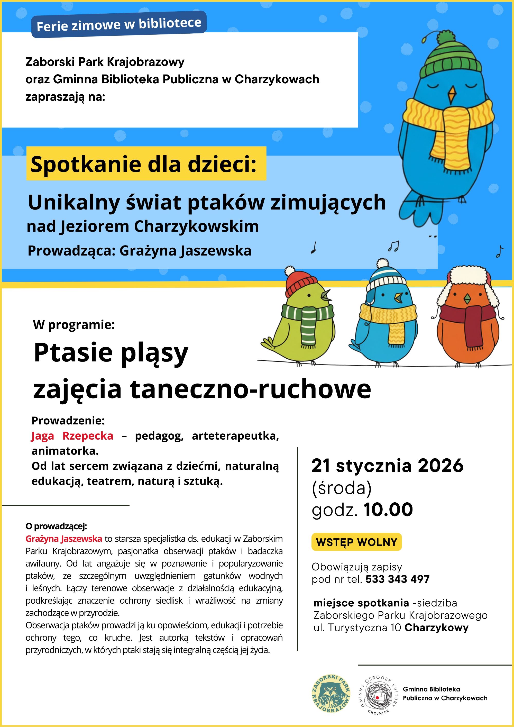Zaborski Park Krajobrazowy oraz Gminna Biblioteka Publiczna w Charzykowach zapraszają na zimowe spotkanie dla dzieci podczas ferii zimowych, które odbędzie się 21 stycznia o godzinie 10:00 w siedzibie Zaborskiego Parku Krajobrazowego ul. Turystyczna 10 w Charzykowach. Wstęp wolny, obowiązują zapisy pod numerem tel. 533 343 497