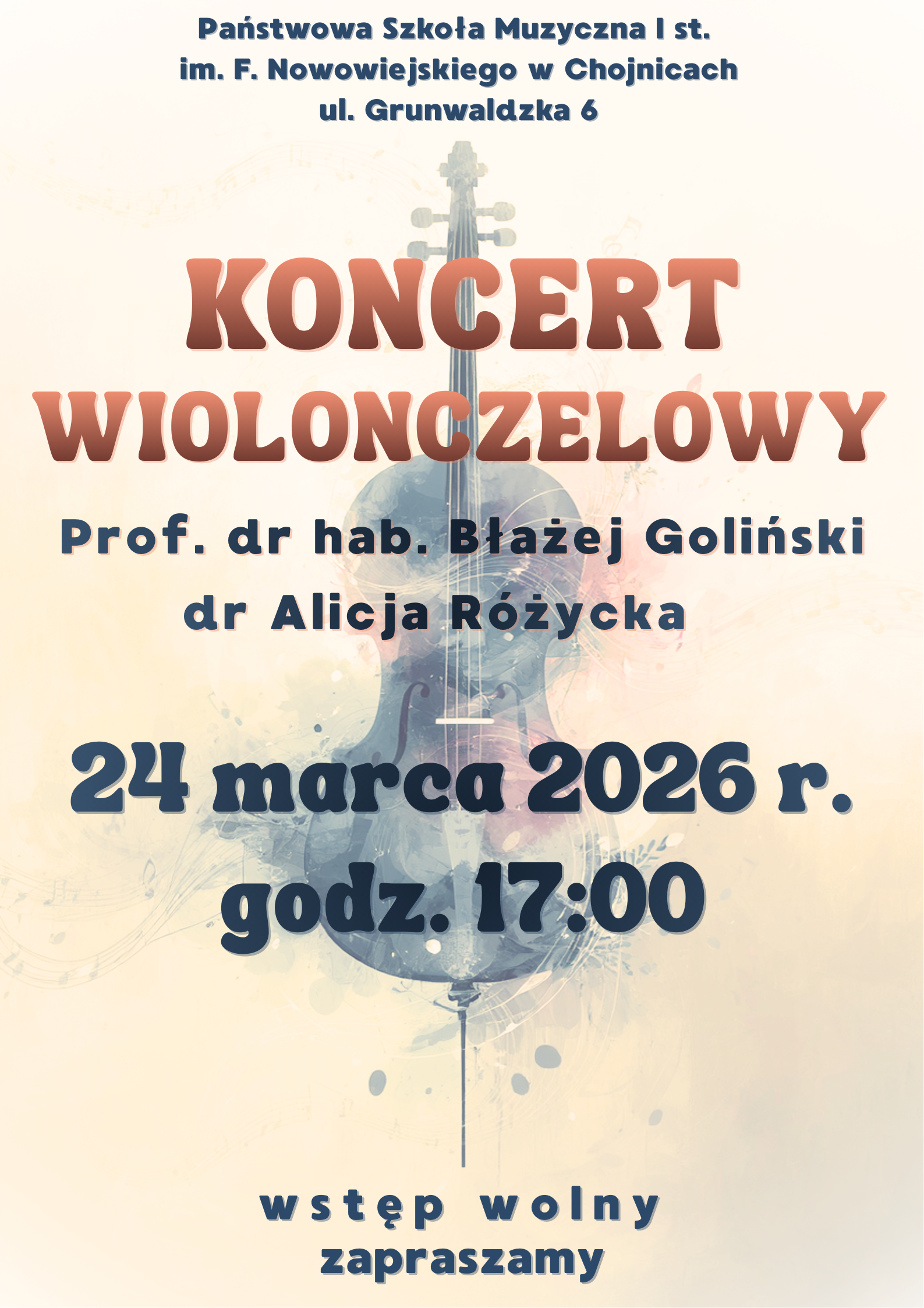 Zapraszamy na koncert wiolonczelowy, który odbędzie się w sali koncertowej Państwowej Szkoły Muzycznej I st. W Chojnicach, we wtorek 24.03 o godzinie 17:00. Będziemy gościć profesora Błażeja Golińskiego, koncertmistrza Bałtyckiej Filharmonii i profesora Akademii Muzycznej w Gdańsku. Razem z naszą nauczycielką klasy wiolonczeli Alicją Różycką zaprezentują lekki i wiosenny repertuar wiolonczelowy.