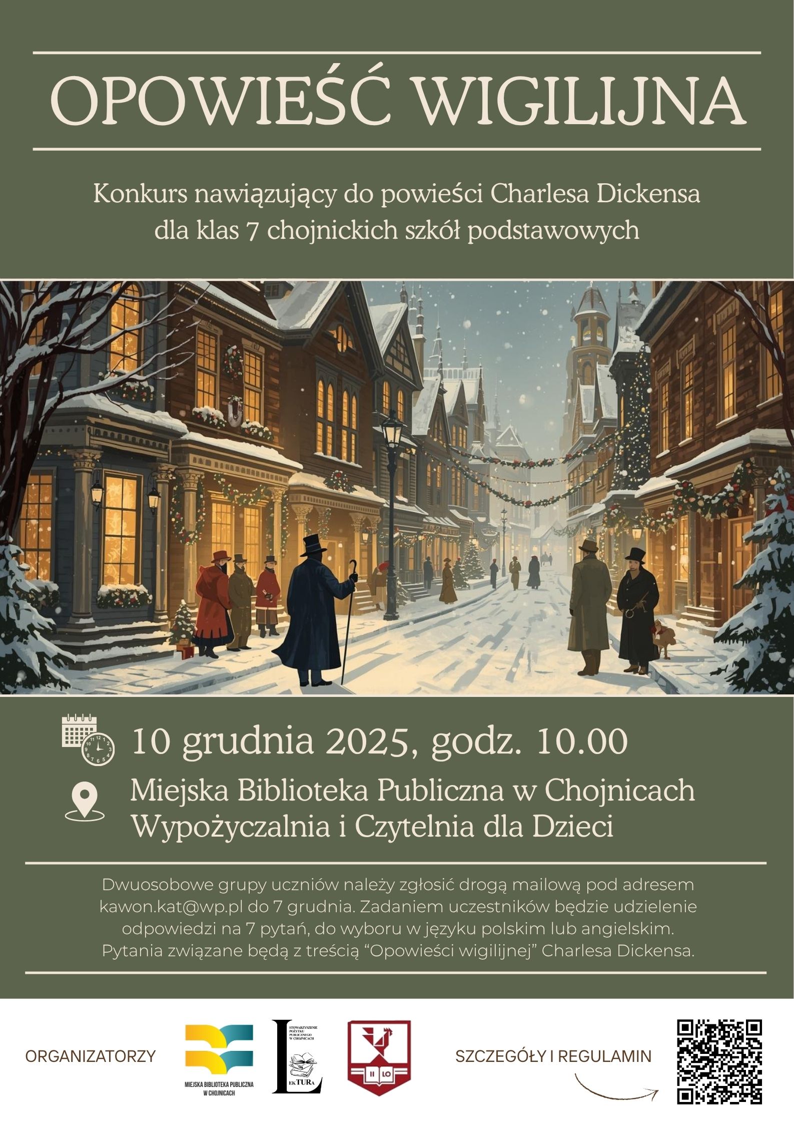 Miłośników świątecznego klimatu i powieści Charlesa Dickensa „Opowieść wigilijna” zachęcamy do wzięcia udziału w konkursie związanym z treścią książki. Odbędzie się on w Wypożyczalni i Czytelni dla Dzieci MBP w środę 10 grudnia 2025 roku w godzinach 10.00–12.00 i adresowany jest do uczniów klas 7 chojnickich szkół podstawowych.
