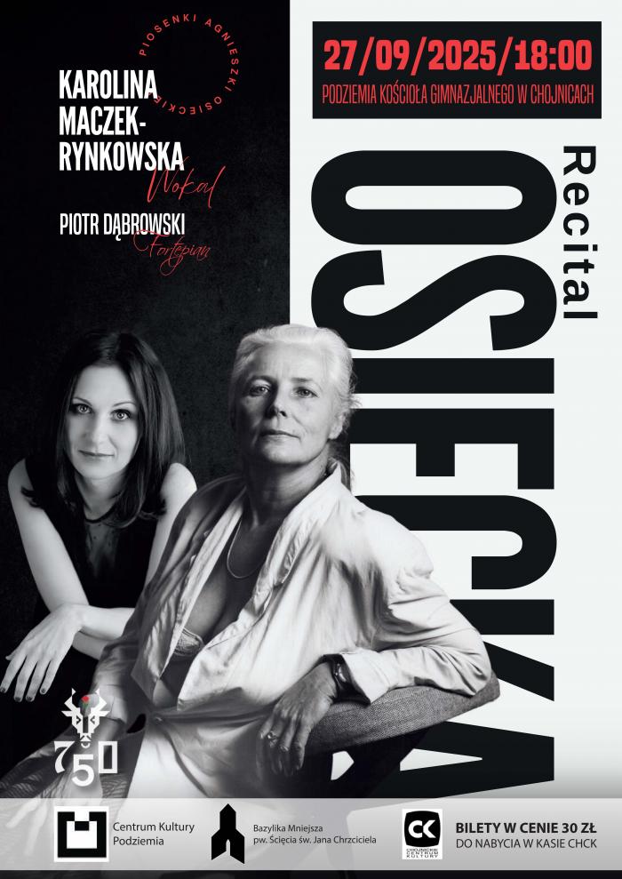 W sobotę 27 września w podziemiach kościoła gimnazjalnego w Chojnicach odbędzie się recital „Osiecka” w wykonaniu Karoliny Maczek-Rynkowskiej (wokal) oraz Piotra Dąbrowskiego (fortepian). Bilety: 30 zł do nabycia w kasie Chojnickiego Centrum Kultury