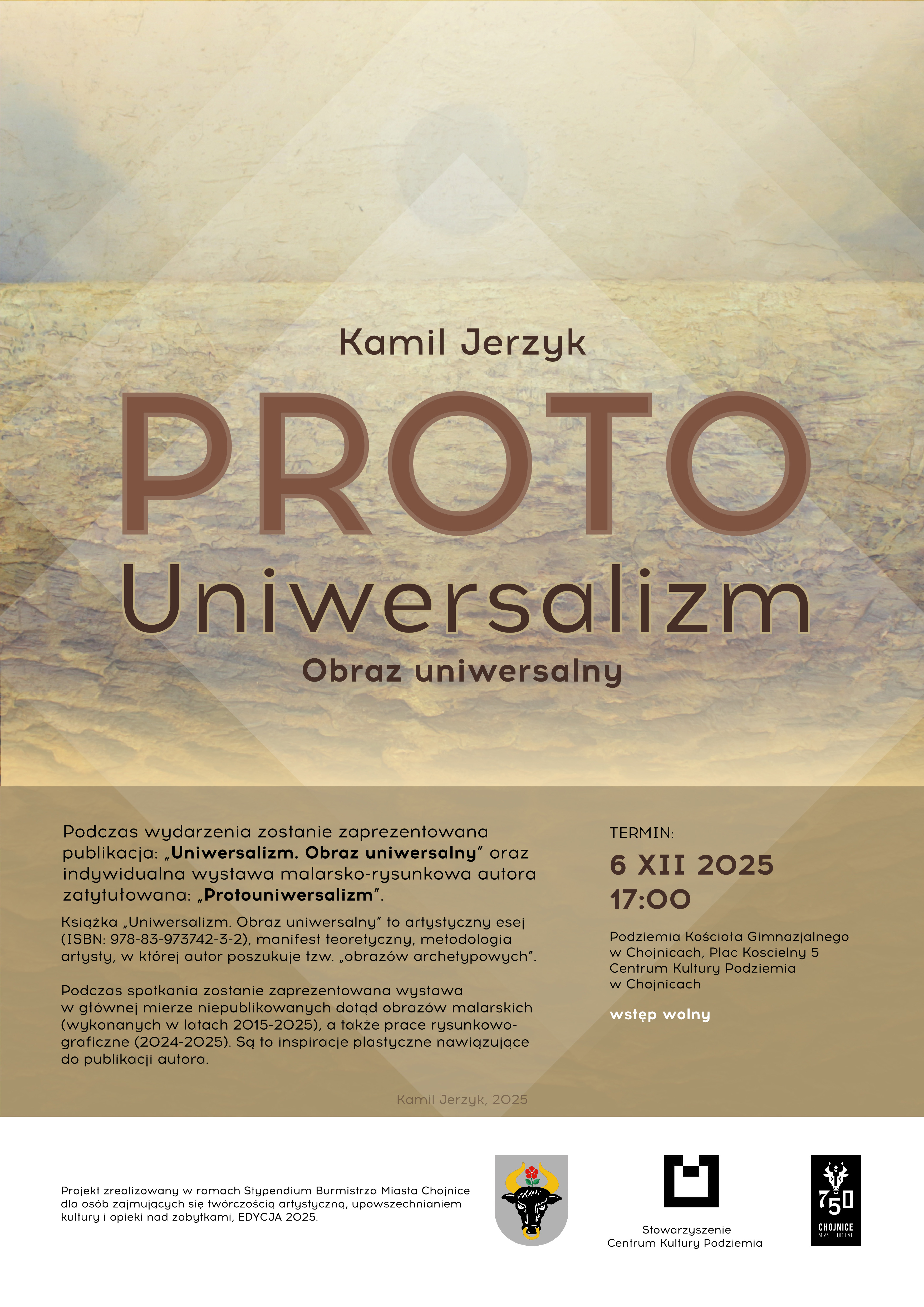 W ramach wydarzenia odbędzie się prezentacja publikacji pt. „Uniwersalizm. Obraz uniwersalny” autorstwa Kamila Jerzyka, stypendysty Burmistrza Miasta Chojnice. Upublicznieniu wydawnictwa będzie towarzyszyć malarsko-rysunkowa wystawa prac autora, nawiązująca do publikacji. Planowana jest także dyskusja artysty z publicznością.