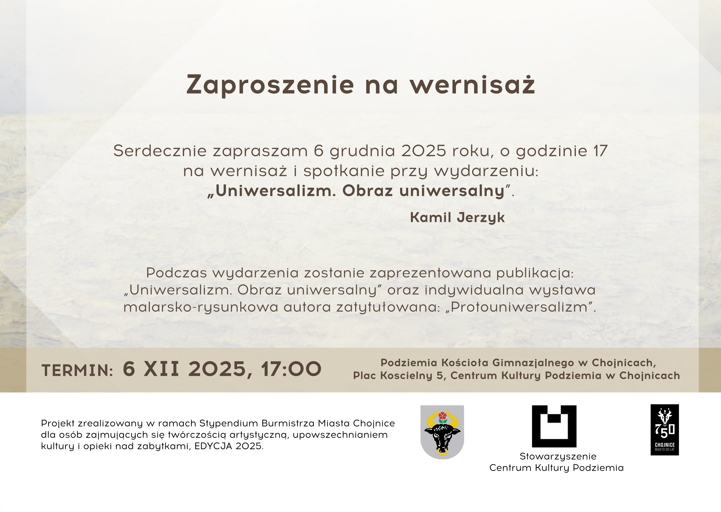 Chojnickie Stowarzyszenie Centrum Kultury Podziemia zaprasza na wyjątkowe wydarzenie z zakresu sztuk pięknych, które odbędzie się 6 grudnia o godz. 17:00 w Podziemiach Kościoła Gimnazjalnego.