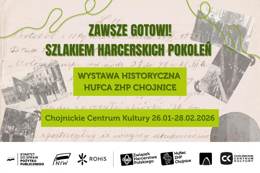 W Chojnickim Centrum Kultury od 26 stycznia można będzie oglądać wystawę „Zawsze gotowi! Szlakiem harcerskich pokoleń!”, która opowiada o ponad stuletniej obecności harcerstwa na ziemiach chojnickich. Wystawa czynna od 26 stycznia do 28 lutego 2026 w godzinach funkcjonowania Chojnickiego Centrum Kultury.
