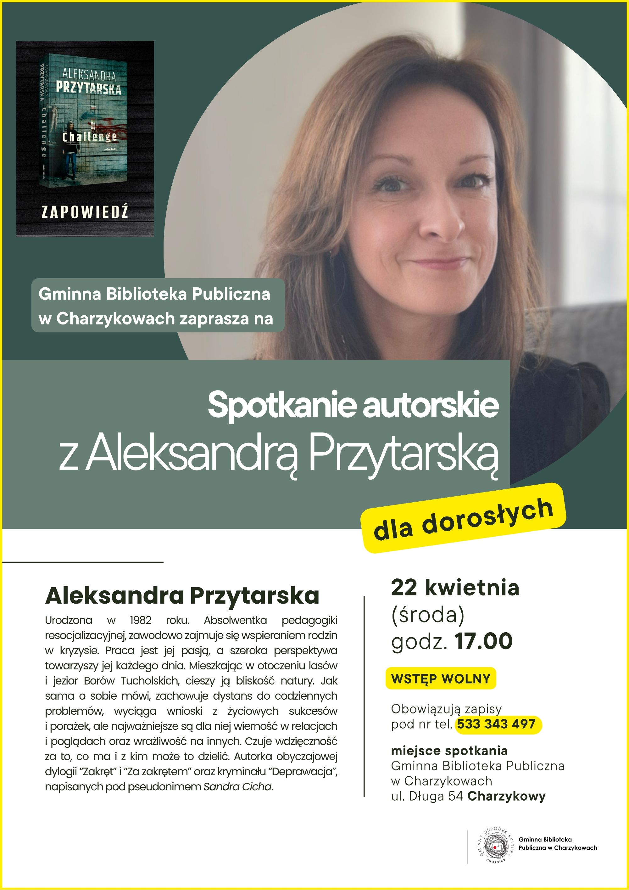 Zapraszamy 22 kwietnia o godz. 17.00 do Gminnej Biblioteki Publicznej w Charzykowach odbędzie się promocja najnowszej książki Aleksandry Przytarskiej „Challenge”.