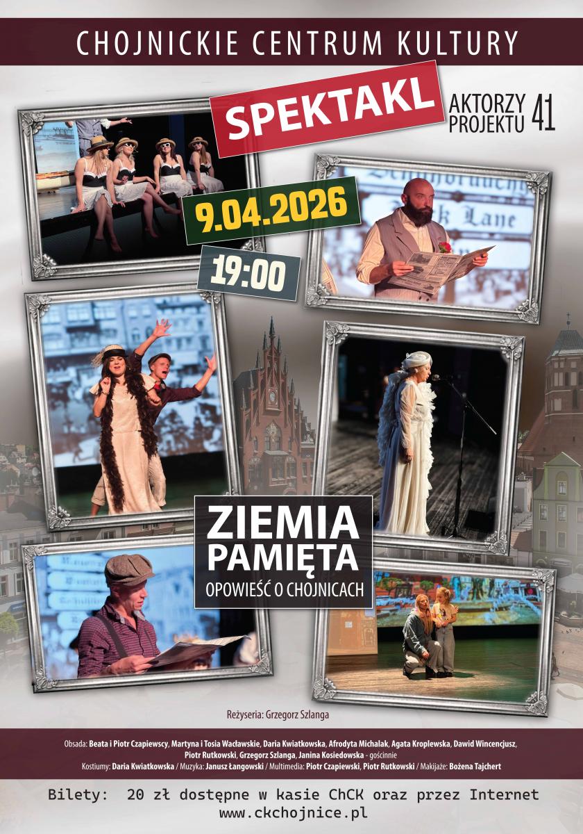 Chojnickie Centrum Kultury zaprasza 9 kwietnia na godzinę 19:00 na pokaz spektaklu "Ziemia pamięta. Opowieść o Chojnicach" Projektu 41. Wydarzenie to odbęd