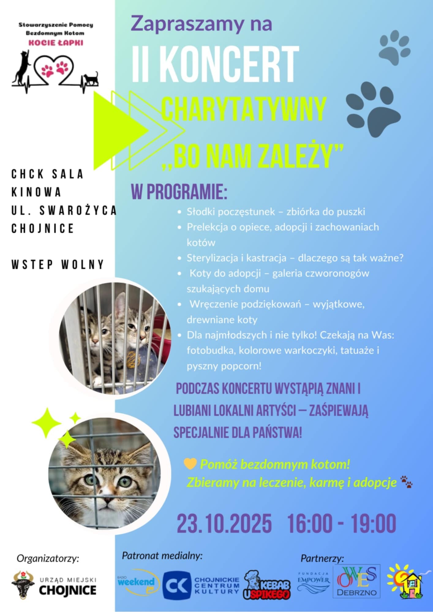 Zapraszamy na II Koncert Charytatywny „ Bo Nam Zależy”, 23 października do Chojnickiego Centrum Kultury. Wydarzenie rozpocznie się o godzinie 16:00.