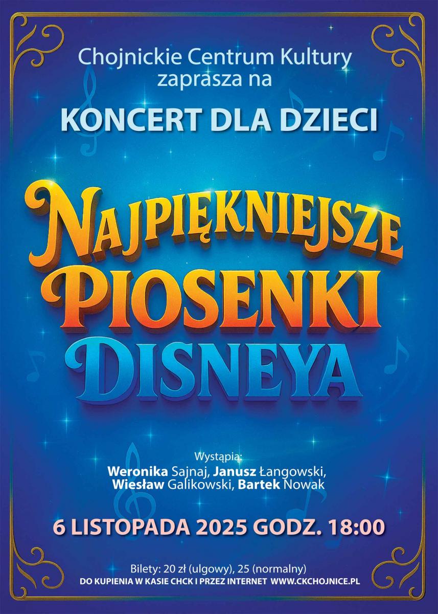 Chojnickie Centrum Kultury zaprasza 6 listopada 2025 o godz. 18:00 na niesamowity koncert dla dzieci „Najpiękniejsze piosenki Disneya”.