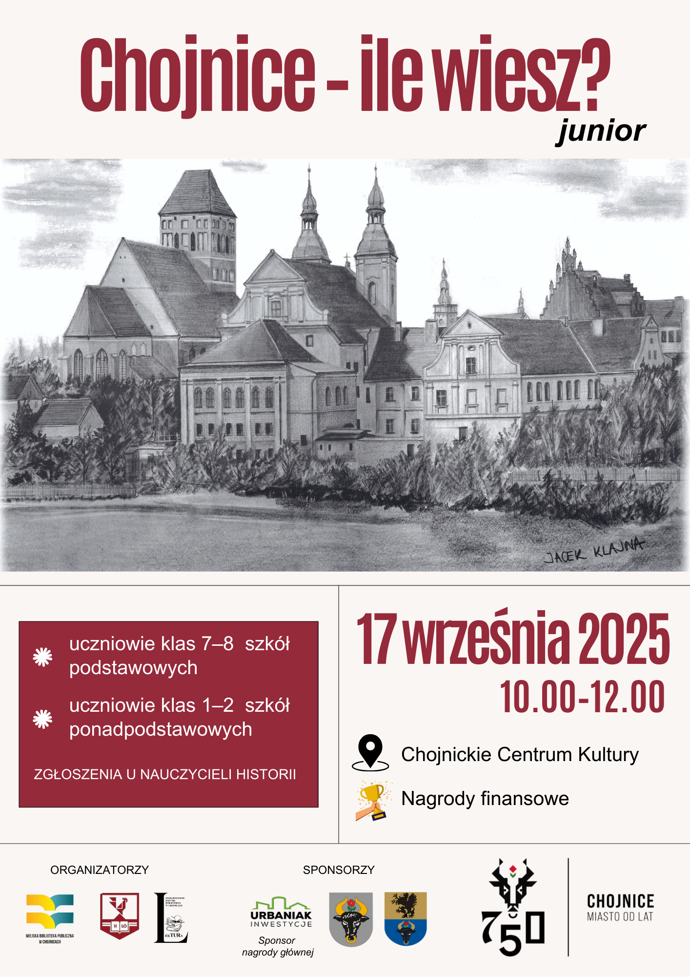W ramach 750-lecia Chojnic Miejska Biblioteka Publiczna w Chojnicach, II Liceum Ogólnokształcące im. gen. Władysława Andersa w Chojnicach oraz Stowarzyszenie LekTURa organizują ponownie konkurs historyczny „Chojnice – ile wiesz?” Jest to druga edycja rywalizacji, tym razem skierowana do uczniów klas 7–8 szkół podstawowych i klas 1–2 szkół ponadpodstawowych.