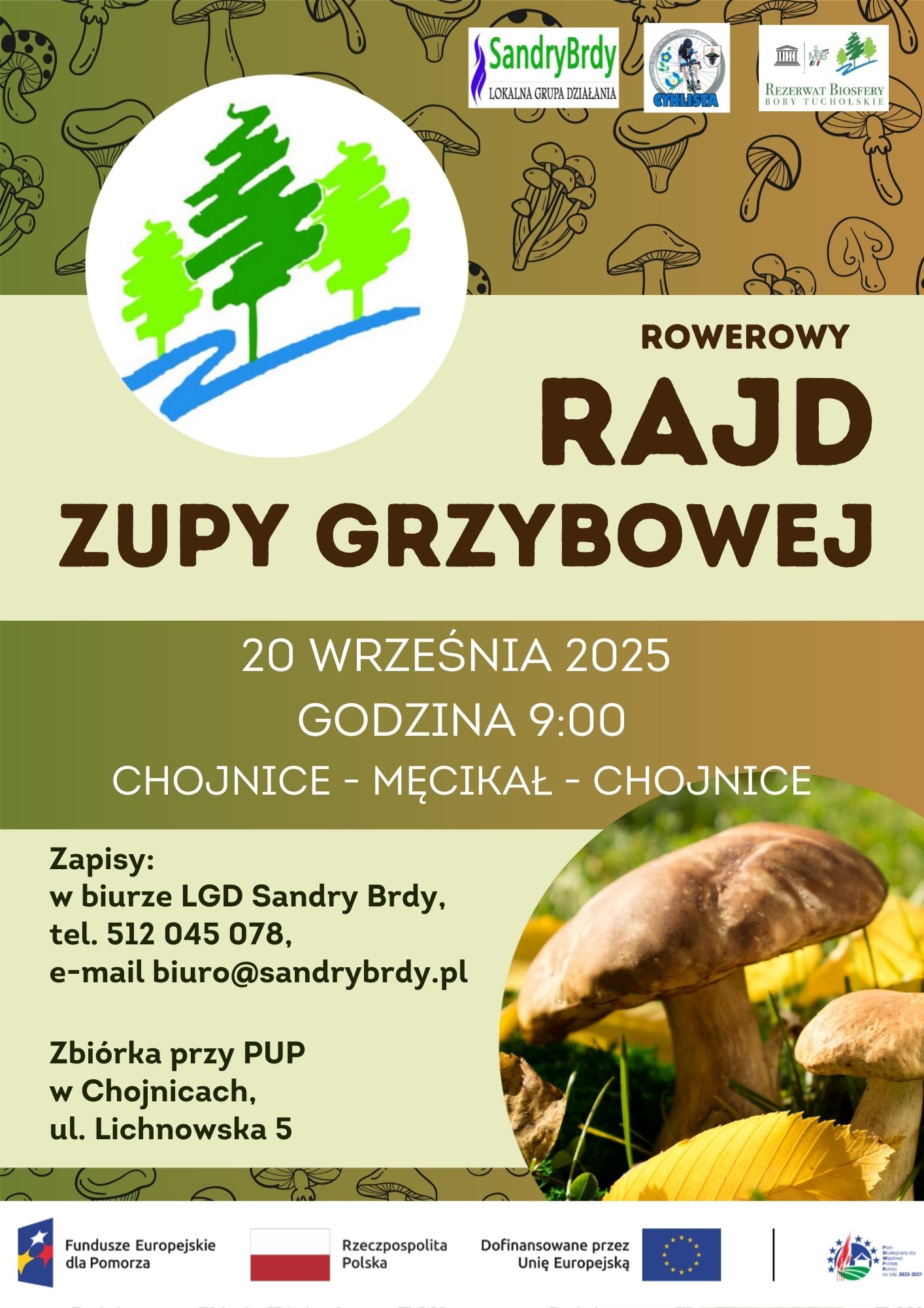Lokalna Grupa Działania Sandry Brdy oraz Chojnickie Towarzystwo Miłośników Roweru CYKLISTA zapraszają wszystkich miłośników rowerów i piękna naszych terenów do udziału w Rowerowym Rajdzie Zupy Grzybowej.