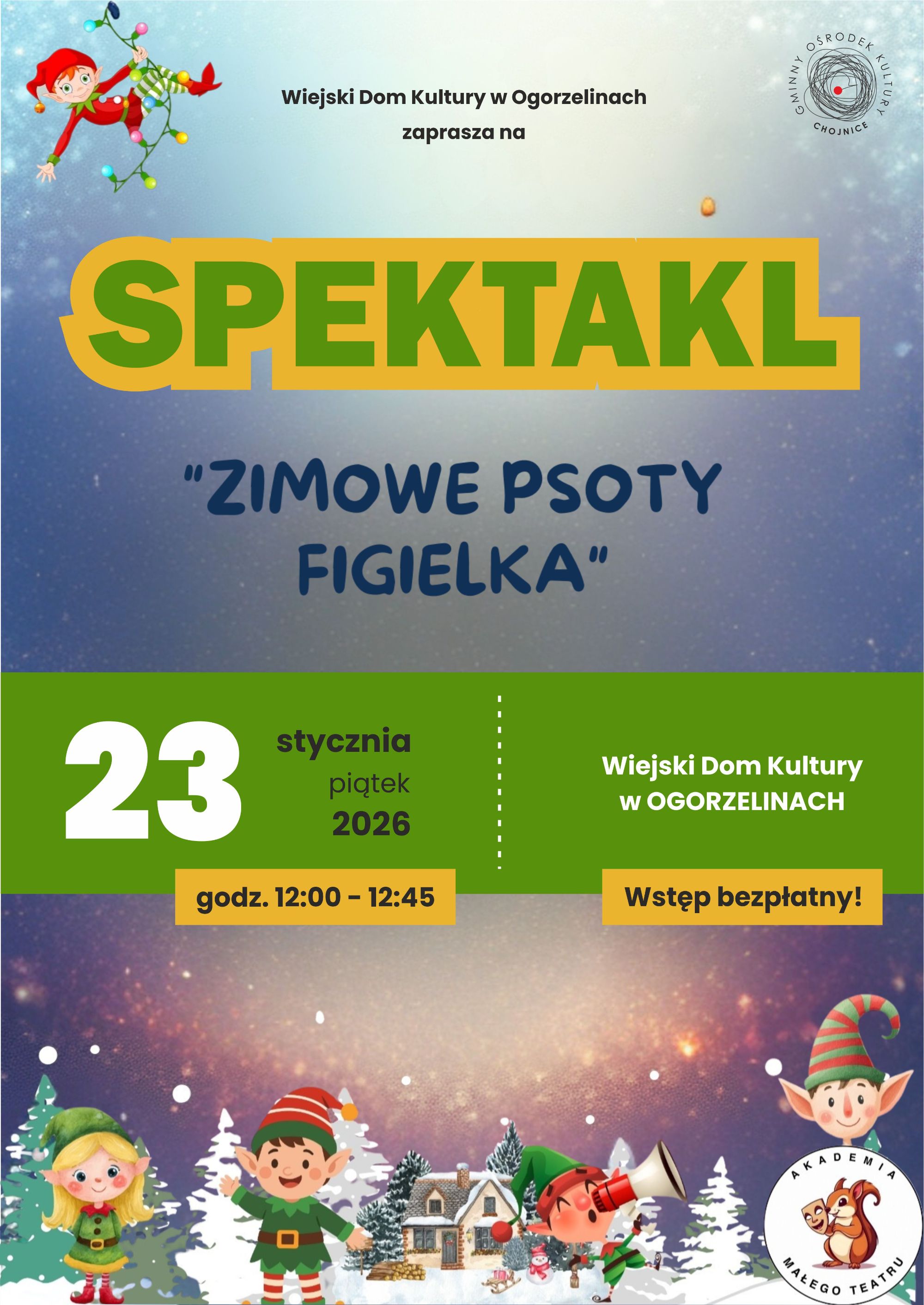 Zapraszamy 23 stycznia o godzinie 12:00 na Spektakl "Zimowe Psoty Figielka" w wykonaniu Akademii Małego Teatru Spektakl odbędzie się w Wiejski Dom Kultury w Ogorzelinach