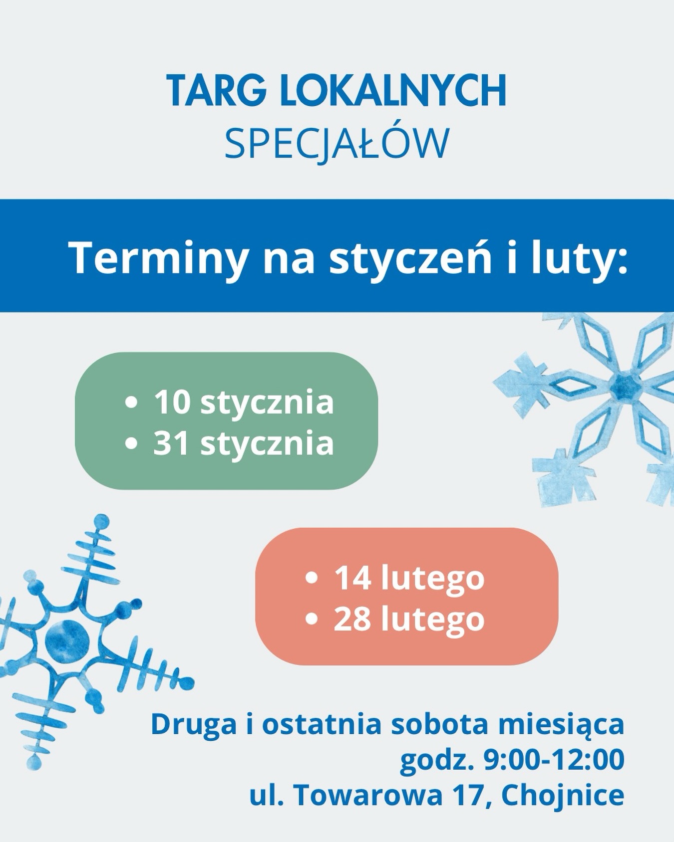 Targ ma charakter cykliczny i odbywa się w drugą i ostatnią sobotę miesiąca, w godzinach 9:00–12:00. Dzięki sezonowości oraz zróżnicowanym warunkom upraw, oferta każdego targu jest unikalna. Zachęcamy do regularnych odwiedzin – za każdym razem można odkryć coś nowego.