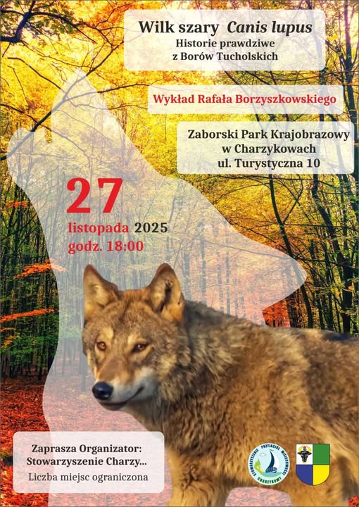 Stowarzyszenie Charzy...zaprasza do siedziby Zaborskiego Parku Krajobrazowego w Charzykowach 27 listopada o godzinie 18:00 na wykład Rafala Borzyszkowskiego z Tucholskiego Parku Krajobrazowego pt. „Wilk szary Canis lupus. Historie prawdziwe z Borów Tucholskich”