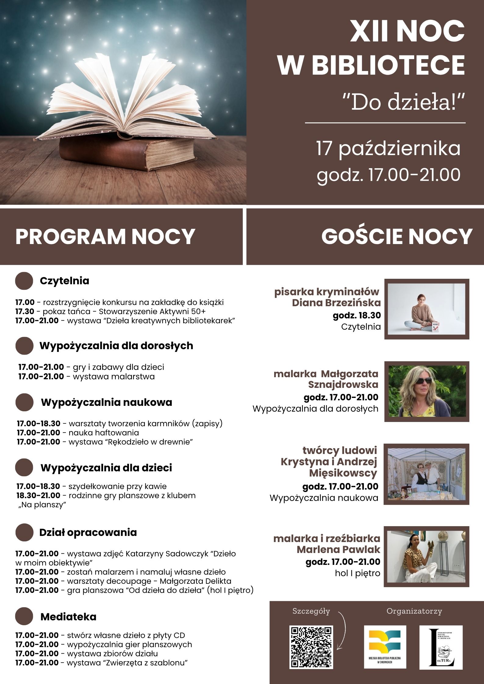 Miejska Biblioteka Publiczna w Chojnicach oraz Stowarzyszenie LekTURa zapraszają na kolejną XII Noc w Bibliotece, która odbędzie się w ramach ogólnopolskiej Nocy Bibliotek, a jej hasło przewodnie brzmi: „Do dzieła!”. Akcja odbędzie się w piątek 17 października 2025 roku w godz. 17.00-21.00. Na odwiedzających wszystkie działy biblioteki czekać będzie mnóstwo spotkań, twórczych warsztatów, wystaw i dobrej zabawy! Zapraszamy dzieci, młodzież, dorosłych i całe rodziny – każdy znajdzie coś dla siebie! Przyjdź, odkryj bibliotekę na nowo! Włącz się w twórcze działanie!